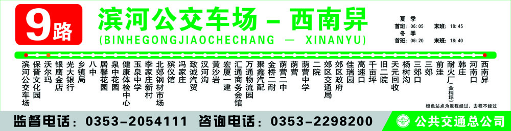 濱河公交車場 - 保晉文化園 - 銀鷹金店 – 光大銀行 - 鄉(xiāng)鎮(zhèn)局 - 八中 - 居馨花園 – 泉 中花園 - 健康體檢中心 - 玉泉中學 - 李家莊新村 - 北郊鋼材市場 – 殯儀館 - 馮家莊 – 致誠汽貿(mào) - 漢河溝 - 黃沙巖 - 匯通商務(wù)會館 - 萬通物流園 - 聚鑫汽配 - 金橋二耐 - 蔭營二中 - 蔭營 - 蔭營中學 - 二院 - 郊區(qū)交通運輸局 - 郊區(qū)政府 - 佳瑞園 - 高速口 - 千畝坪 - 舊二院 - 天元回 收 - 楊樹溝 - 三郊口 - 新世紀 - 三郊 - 前洼 - 耐火廠(金梢坪)- 韓莊 - 河南口 - 西南 舁 - 五里莊 - 雨下溝